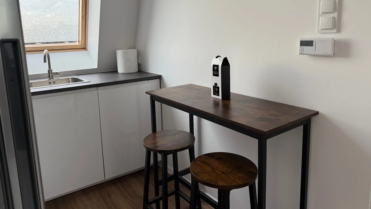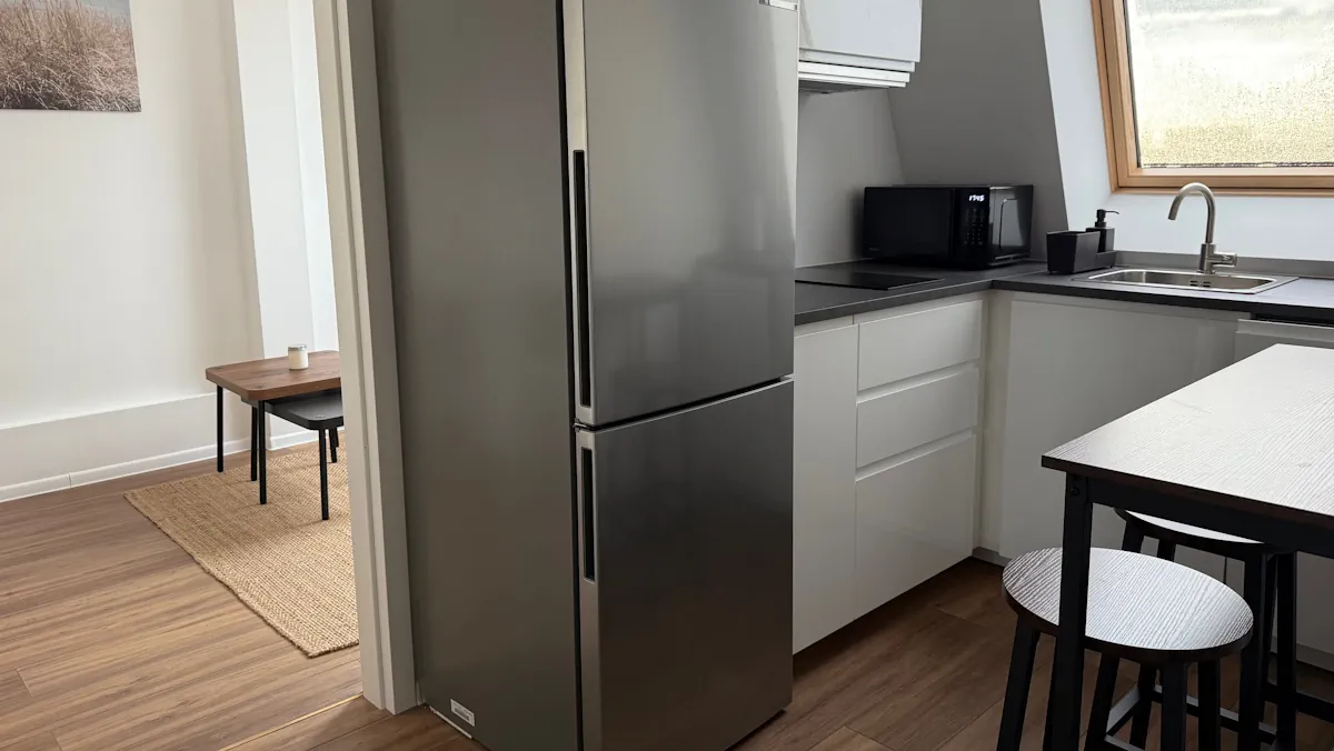 - Kitchen ― BOSCH big fridge & freezer, dishwasher, induction hob, extractor hood, microwave, airfryer, complete cookware, cutlery & crockery for 4. Of course, a table and 2 chairs.